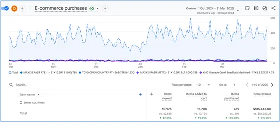 For ecommerce businesses, it all comes down to revenue. We understand that your bottom line is the ultimate measure of success. That’s why we’re so proud to share this real-world example of how our Ecommerce SEO strategies can deliver tangible results.This chart illustrates the dramatic impact of our SEO efforts for one of our valued clients. By implementing a comprehensive SEO strategy, we achieved the following results in just six months:Items Viewed: Increased by 42.35%Items Added to Cart: Increased by 19.69%Items Purchased: Increased by 110.05%Organic Revenue: Soared by 127.87%